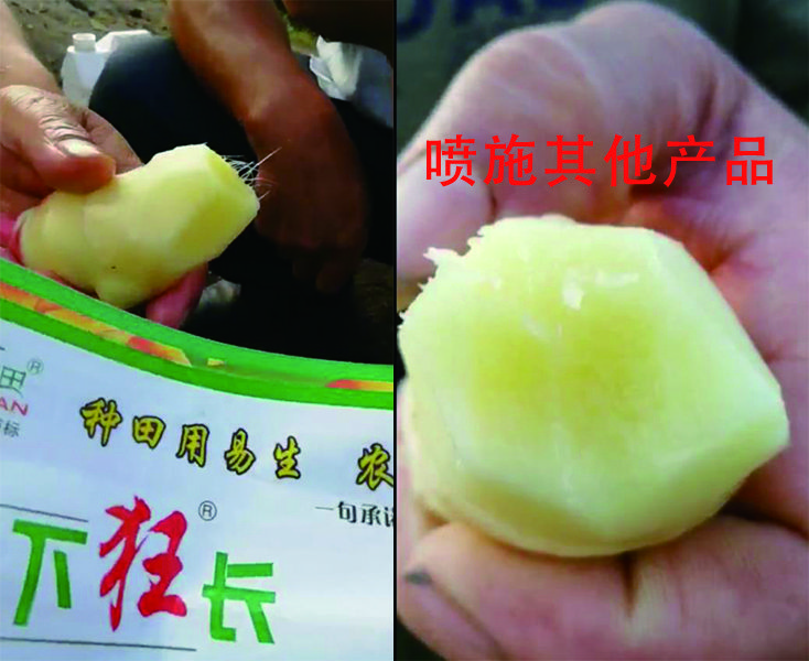 同一塊地同一種子,連水分管理都相同,噴施過地下狂長的與噴施其他產(chǎn)品的大姜效果就是 不一樣。掰開大姜后,明顯的看到噴施過地下狂長的大姜姜絲又多又長,農(nóng)民嘗了一下,心頭樂開了花,滿意地說:“辣到咽不下去”。
